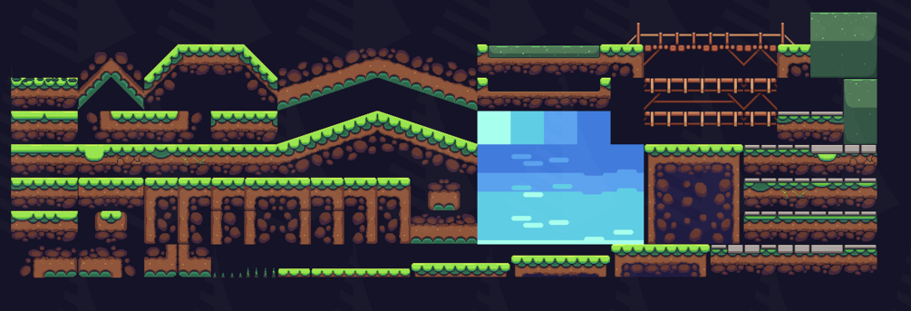 Useful for creating forest levels in 2D, complete with tiles, props, sky, backgrounds and platforms.